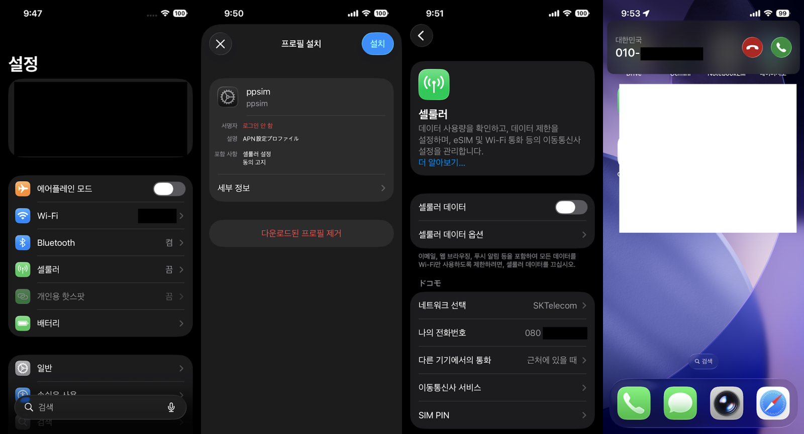 도코모라고 뜨고, 나의 전화번호가 잘 뜬다! 이 번호로 다른 휴대폰에서 국제전화를 걸어봤는데 잘 수신도 된다! 야호!
