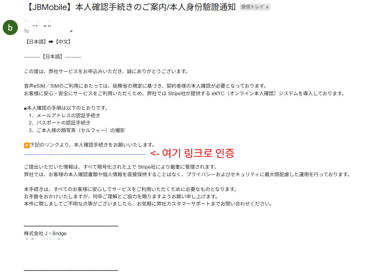 가입 및 결제를 마치면 이메일로 Stripe eKYC(온라인 본인인증) 링크가 날아옵니다. 일본 통신법상 ‘음성 통화와 SMS’ 기능이 포함된 번호를 개통하려면 범죄 악용을 막기 위해 엄격한 본인 확인이 필수라고 하네요. 다행히도 Stripe는 공신력 있는 회사이므로(아마도) 여권정보를 보내도 안전할 것 같아 보입니다.